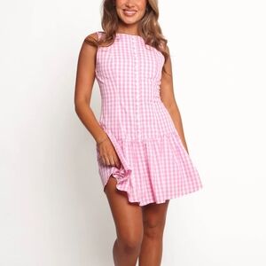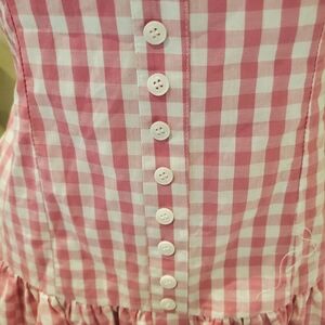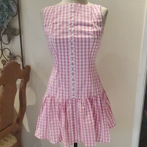 Stylish pink checkered mini dress. Sleeveless with front buttons. Ideal for casual wear.