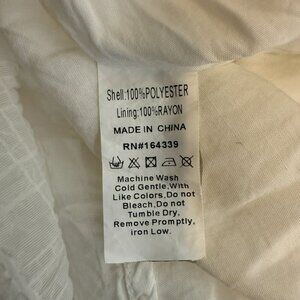 The Petal + Pup Quinnie Balloon Sleeve Mini Dress is a stunning white formal dress with a V-neckline and long balloon sleeves, perfect for a party, bridal event, or wedding. Made from a blend of polyester and rayon, this dress features a gauzy fabric with ruffle accents, layered bow details, and embroidered blooms, adding a touch of elegance and charm. The fit and flare style with a high waist and adjustable tie closure makes it a flattering and comfortable option for women in size Large. Easy to care for with machine washable instructions, this dress is ideal for various occasions in different seasons.