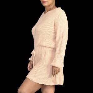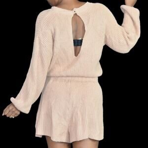 Petal + Pup Saige Playsuit FEATURE a ribbed sweater knit fabric and a loose fitting slouchy fit. Round neck. Open keyhole button closure in back. Long sleeves. Elasticized drawstring waist. Flared short with short inseam.