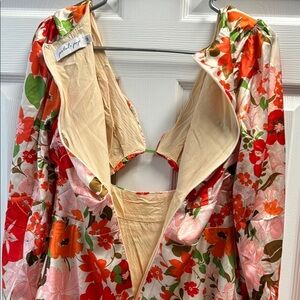 Vibrant floral dress with a cut-out detail. Long sleeves and a flowy fit. Perfect for any occasion.