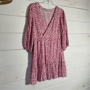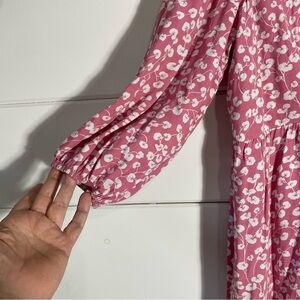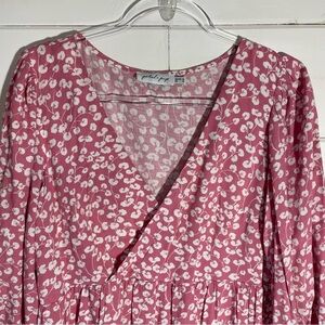Keywords: Petal & Pup, floral dress, pink dress, knee length dress, women's fashion, V-neck dress, long sleeve dress, spring dress, summer dress, casual dress, party dress, cocktail dress, surplise bodice, size 12, pre-owned dress