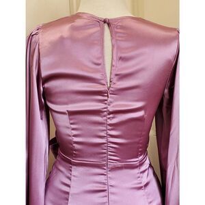 Gorgeous billowy long sleeves, lavender, silky soft Satin faux wrap dress. Knee length, round neck.