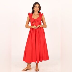 This beautiful red midi dress is here to make you look and feel fabulous! Featuring an elegant sweetheart neckline, elasticised straps with a ruffle detail, and an attached front tie bust feature, this dress is full of feminine charm.