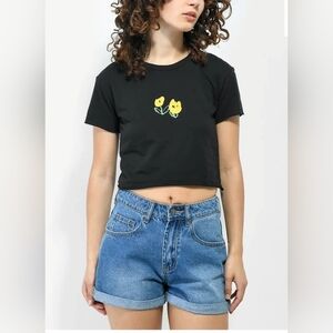 Embrace a playful vibe with this black crop top featuring a vibrant 'Flower Power' design. Perfect for casual outings.