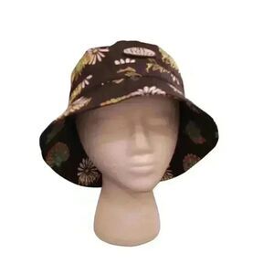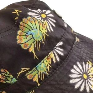 Petals & Peacocks Women's Black w Daisies & Peacocks Print Poly Bucket Hat EUC sz OS One Size