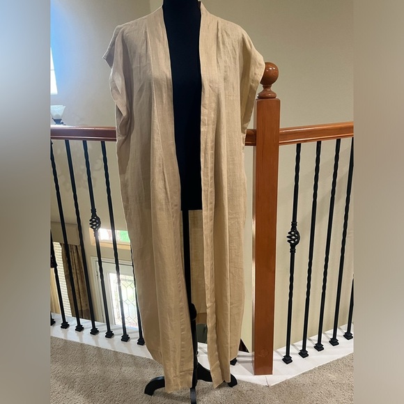 VINTAGE LIMITED EDITION KIMONO BY PETALS, ELEANOR COPPOLA AND MARJORIE BOWERS, 100% LINEN, HAS SIDE SEAM POCKETS, NO SIZE TAG, PTP 23.5” AND LENGTH IS 46”, DUSTER, LAGENLOOK: PRE OWNED IN EXCELLENT CONDITION: