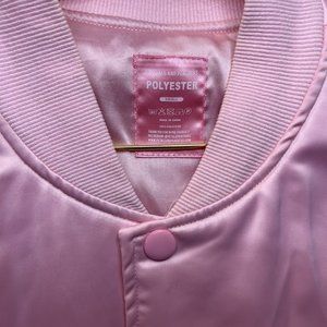 Pink satin bomber with "Girl Power + Skeleton" patch on the back. Snap button closure and front pockets. Medium/heavy weight puff bomber