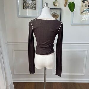 Pete stretchy cropped V-neck with beige contrast stitching and mesh trim in at the neck and hem. The dark brown fabric is subtly cabled in texture. Laying flat measures 18.5 inches shoulder to hem and 15 inches armpit to armpit.