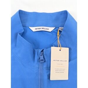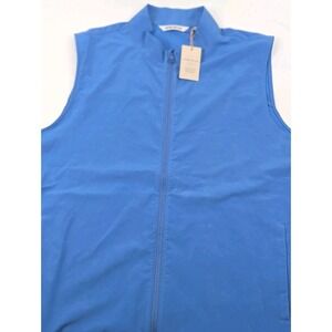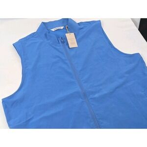 Peter Millar Crown Sport Dunes windbreaker vest offers high-performance protection for blustery conditions. Crafted from a lightweight double-weave fabric, this piece features four-way stretch for maximum mobility and a water-resistant, wind-resistant finish. The vibrant blue hue is complemented by a full-zip front, mock neck, and side zip pockets for secure storage. Designed with recycled polyester and spandex, it ensures easy care and lasting comfort on or off the golf course.
