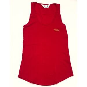 Red tank top with dog logo on chest. Blue boxer shorts with red, elastic waistband and Snap, Crackle, Pop cereal mascot print.