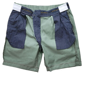 Peter Christian Men's Pleated Shorts in size 38 with a 10" inseam are a stylish and versatile choice for casual occasions or travel. Made of comfortable cotton material with a medium fabric wash, these green shorts feature a solid pattern and a mid rise fit. The zip closure, elastic waist, and slash pockets add practical features to these chino style shorts, perfect for wearing in the summer, fall, or spring seasons. Easy to care for and with a regular fit, these shorts offer a classic and timeless look for any man's wardrobe.