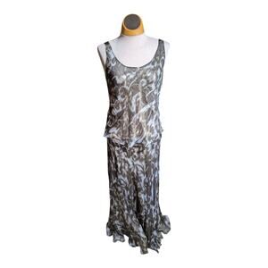 Dark gray and white abstract printed 100% silk sleeveless tank top and elastic waist maxi skirt set, from Peter Cohen.