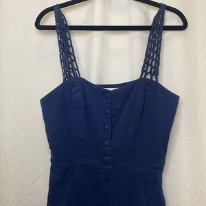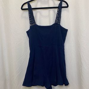 Peter Jensen stunning navy blue romper with beautiful crochet straps & adorable button detail, side zipper, dress up or down, casual lightweight fun, perfect for spring & summer, 100% cotton, size S