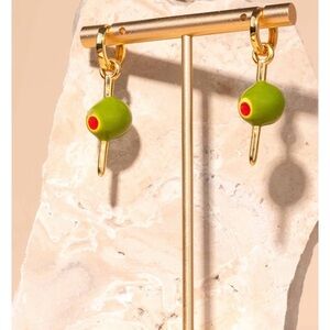 Olive it! These earrings feature an 18k gold plate over stainless steel, and a hand painted enamel olive. They are also waterproof! Dangles at about 4cm