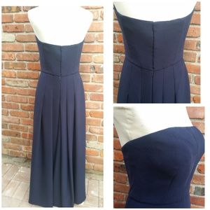 Peter Langer for Michelle Roth Strapless Navy Blue Bridesmaid Evening Dress Gown size S/M. Good pre-owned condition. Gently worn. No rips or holes. No size or Content fabric label. Please see pictures. Measurements are approximate in inches laying flat.