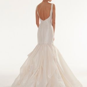 Beautiful custom made silk wedding dress by Peter Langner. Size 6 in top and 8 in bottom. This dress is stunning and cleaned to pristine new condition.
