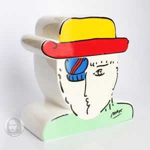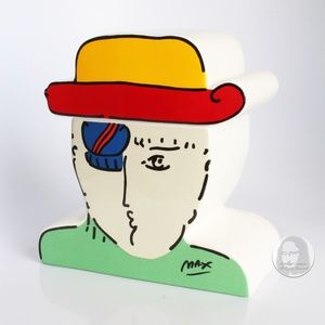 Authentic, preowned, vintage Peter Max 'Zero Man' cookie jar, released in 1989. Made from ceramic, it's painted with Max's signature "Zero Man" on both sides! The hat is used as a lid and the head is used as a jar.