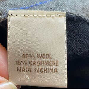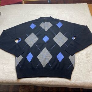 Peter Millar Argyle Wool and Cashmere Button Neck Sweater Size Medium. Excellent like new condition. Tag is cut. Stand up mock collar with hidden buttons. Black with blue tone argyle design. Measures chest 45", length 27", sleeve 27".