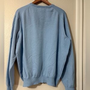 This soft, light blue crewneck sweater is crafted from a smooth knit material, offering a comfortable and casual fit. Ideal for layering in cooler weather, its classic design and uniform color make it a versatile addition to any wardrobe.