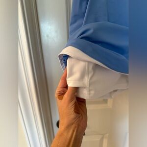 This mini skirt by Peter Millar combines athletic functionality with resort-ready style, featuring a striking asymmetrical wrap design. The blue and white color scheme is accentuated by a diagonal white stripe, adding a dynamic touch to its sporty silhouette. Crafted for comfort and performance, it's perfect for both active and leisurely pursuits. Plenty of pockets!
