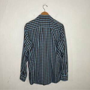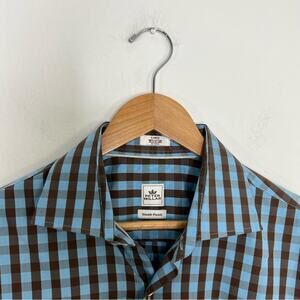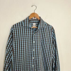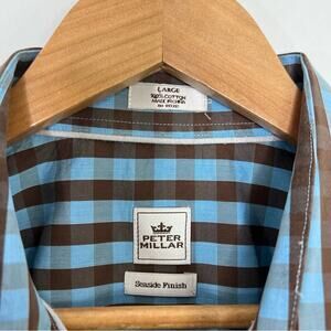 Peter Millar Button Front Seaside Finish Blue Brown Check Shirt Cotton Size L