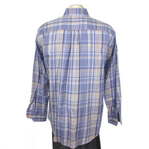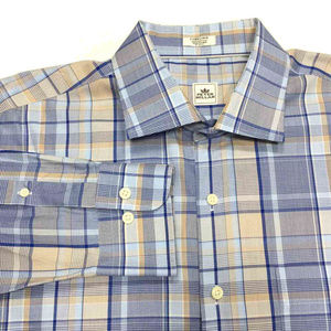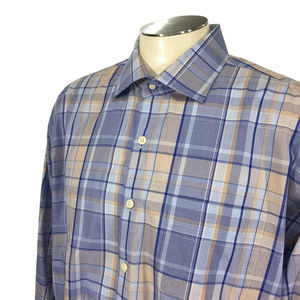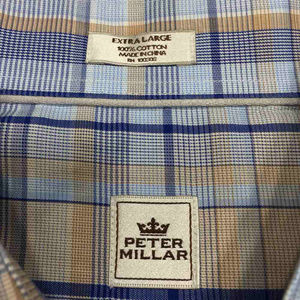 Peter Millar Button Shirt XL Blue Tan White Plaid Dress Work Mens