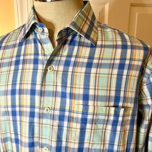 Peter Millar Classic Spread Collar Green Blue Plaid Button Front Shirt LARGE