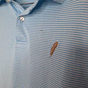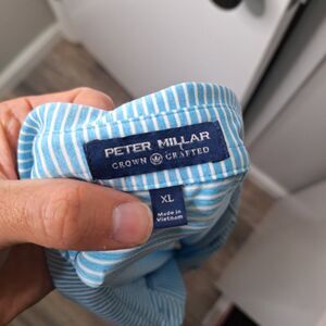 Peter Millar Crown Crafted Polo Shirt Mens XL Blue Striped Performance Stretch. This item is in pre-owned/used condition, showing general signs of wear and tear. There are no rips or holes.The identified flaws are as follows: small stains on front, near logo and small dot stains on back. Flaws are pictured. Please, let me know if you have any questions.
