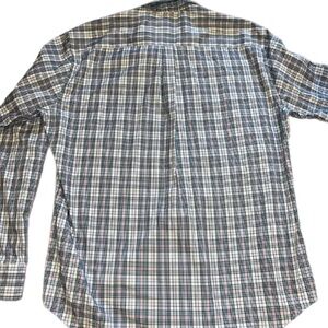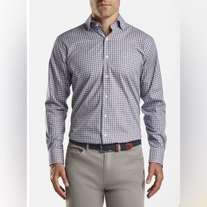 This Peter Millar dress shirt features a sophisticated plaid pattern in blue and red, perfect for both business casual and everyday wear. Crafted from lightweight fabric, it offers comfort and style with a timeless design. The shirt's elegant look is ideal for any occasion.