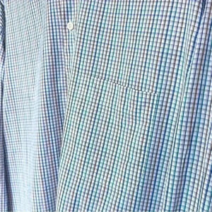 Peter Millar Crown Finish 100% cotton gingham plaid shirt with blue, purple, teal, and brown.