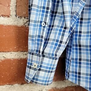 Long-sleeve dress shirt by Peter Millar. From the Spring 2013 collection. Made of 100% cotton in a blue plaid check design. Features a hidden button-down collar, one chest pocket, and barrel cuffs. Extra buttons are attached to the inner placket. Pre-owned with signs of wear and wash. There are two tiny stains: one at the base of the pocket and one on the back collar. They are very small and go nearly undetected. Both shown in pictures. In men's size Extra Large.