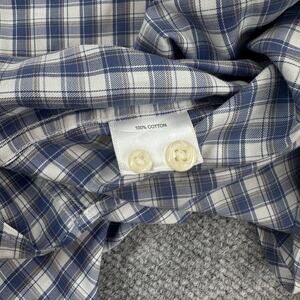 Classic Peter Millar men’s button-up dress shirt in a blue and white plaid pattern. Made from 100% cotton for breathable comfort, perfect for business casual or smart everyday wear. Size Large. Made in Vietnam.