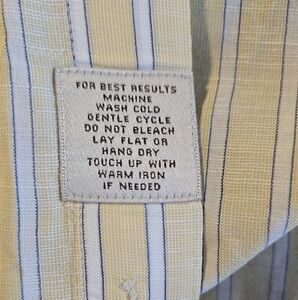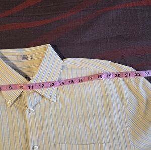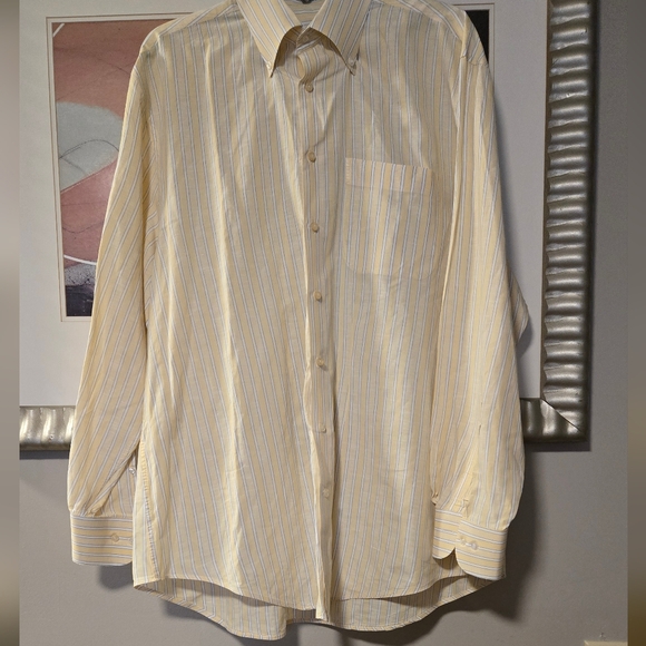 Classic dress shirt with yellow and blue stripes. Ideal for formal and casual settings. Features a button-up front and a chest pocket.