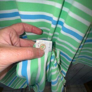 The Peter Millar Men's XL Summer Comfort Short Sleeve Golf Polo Shirt in Blue Striped is a stylish and comfortable garment perfect for the summer season. Made from a blend of polyester and spandex, this polo shirt features a collared neckline, button closure, and embroidered accents. The blue, green, and white striped pattern adds a touch of sophistication to the regular fit design. Ideal for golfing or casual wear, this shirt is machine washable and offers stretch and moisture-wicking features for added comfort and performance.