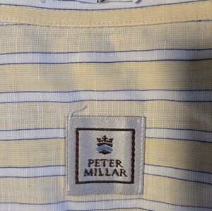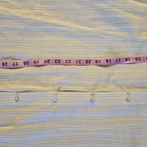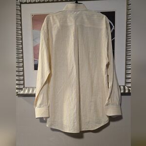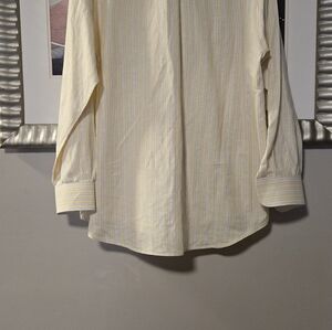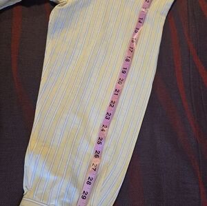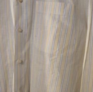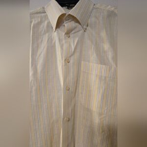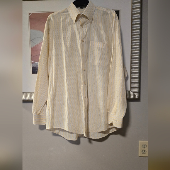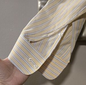 Classic dress shirt with yellow and white stripes. Ideal for formal and casual settings. Features a button-up front and a chest pocket.