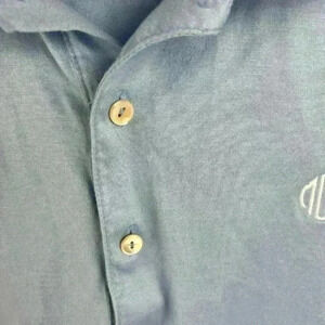 This Peter Millar men's polo in blue is crafted from 100% cotton, offering a comfortable regular fit. It features a classic polo collar and an embroidered logo, suitable for casual outings or semi-formal occasions. Made in Korea, this short-sleeve polo is a versatile addition to any wardrobe. Pre-owned condition.