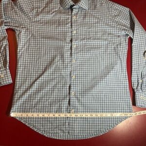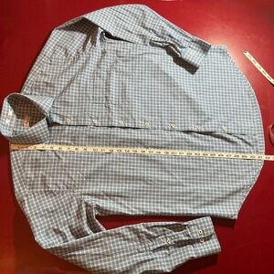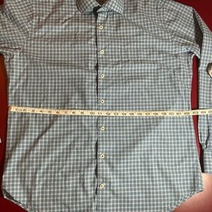 Peter Millar, mens dress shirt, size large, plaid shirt, blue check, tan check, button down, cotton shirt, classic style, office wear, golf wear, preppy style, casual smart, collared shirt, menswear staple