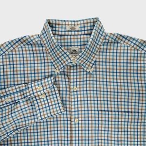 Peter Millar Mens Large Blue Brown Checkered Plaid Long Sleeve Button Down Shirt