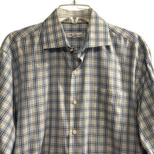 Keywords: Peter Millar, men's shirt, button-up, plaid, blue, long sleeve, casual, collared, cotton, machine washable, large, regular fit, pre-owned, EUC.
