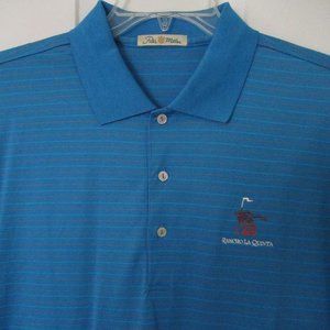 Peter Millar Mens S/S "Rancho La Quinta" Country Club (La Quinta, CA) Blue Cotton Golf Polo Shirt. Size Large. Armpit-to-armpit 24.5", Length 34". 100% Double Mercerized Cotton in Blue Stripe. Made in Korea.