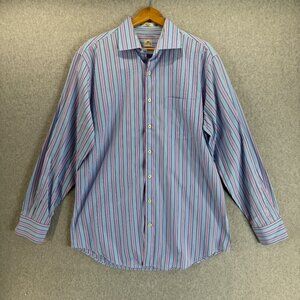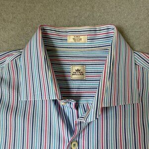 Peter Millar Mens Size Large Blue Pink Striped Button Front Shirt Collared LS