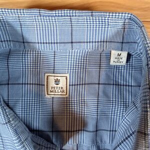 Classic and polished Peter Millar blue plaid button-up shirt in Men’s Medium. Perfect for business casual, the office, golf clubhouse wear, or elevated everyday style. High-quality construction with a soft, comfortable feel.
