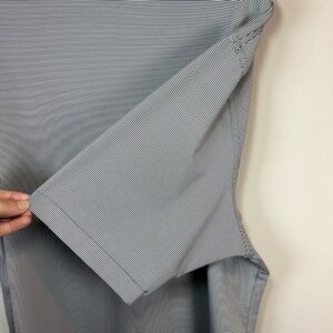 Peter Millar Summer Comfort Polo Shirt Gray White Striped Stretch Side Hem Slits Patch Company Logo On Left Sleeve Golf Outdoor