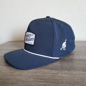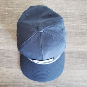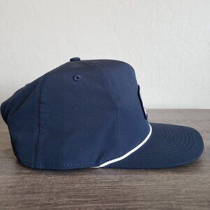 Stylish navy blue hat with white logo patch. Classic design. Perfect for casual wear.