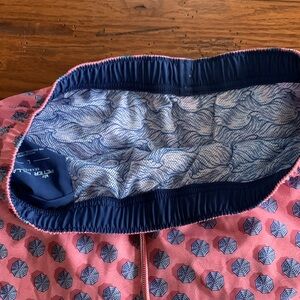 Made from an incredibly soft, quick-drying fabric that features four-way stretch and easy-care, these Ocean City Peter Millar swim trunks are a must-have for seaside excursions. Each print is exclusively hand-designed in their creative studio for one-of-a-kind style. Finished with quarter-top pockets, an elasticized drawstring waist, rubberized aglets and a tagless mesh liner for additional comfort. Gently worn and in great condition. Men’s size large.