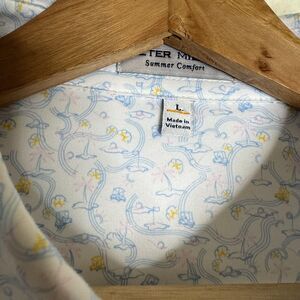 Color/Pattern: Light blue and white with allover floral vine print; embroidered chest logo