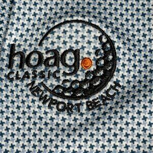 Logos/Branding: Embroidered Hoag Classic Newport Beach logo on sleeve; Peter Millar crown emblem at back of collar