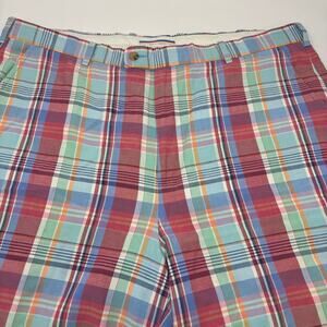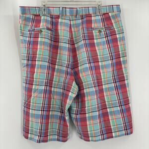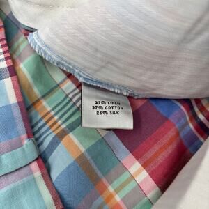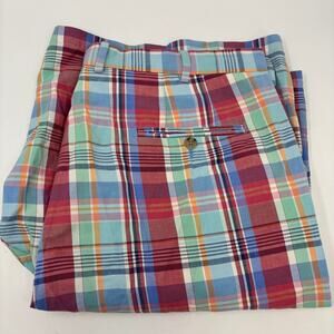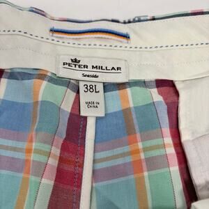 This is a pair of pre owned Peter Millar Seaside Mens Sz38L Multicolor Plaid Flat Front Silk Linen Blend Shorts. This item is in good condition with minimal or no signs of use.