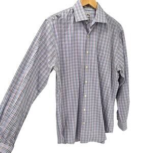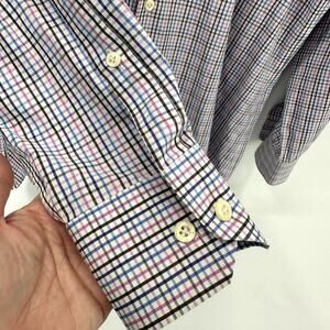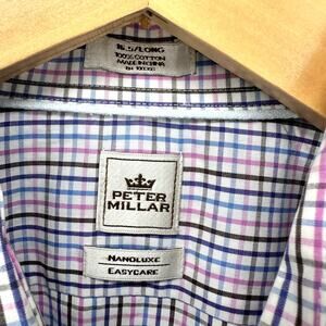 Peter Millar Button Up Shirt Mens 16.5 Long Nanoluxe Plaid Blue Pink White 100% Cotton