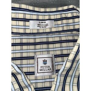 Elevate your wardrobe with this stylish Peter Millar shirt, perfect for any occasion. Featuring a blue and yellow plaid pattern, long sleeves, and a collared neckline with a button-down closure, this shirt is made from 100% cotton and is lightweight for ultimate comfort. It comes in a size L and is machine washable for easy care.